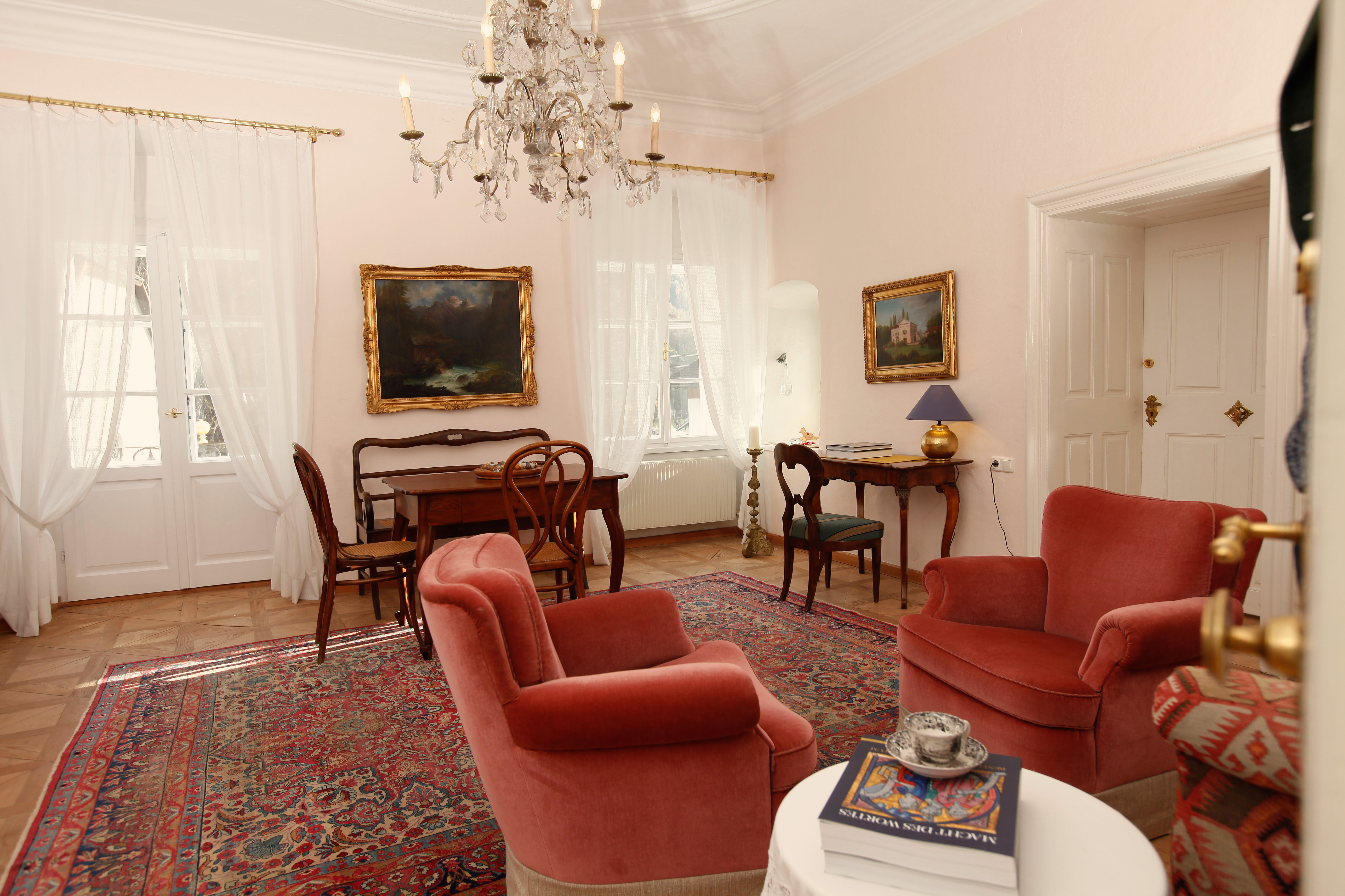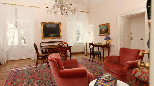 Eine imposante Stiege mit historischem Eisengeländer führt in die Beletage. Hier finden sich 5 große Räume, 2 Bäder und eine weitere Küche. Vom Zentralsalon aus gelangt man auf den barocken, geschwungenen Balkon, der den Haupteingang akzentuiert.